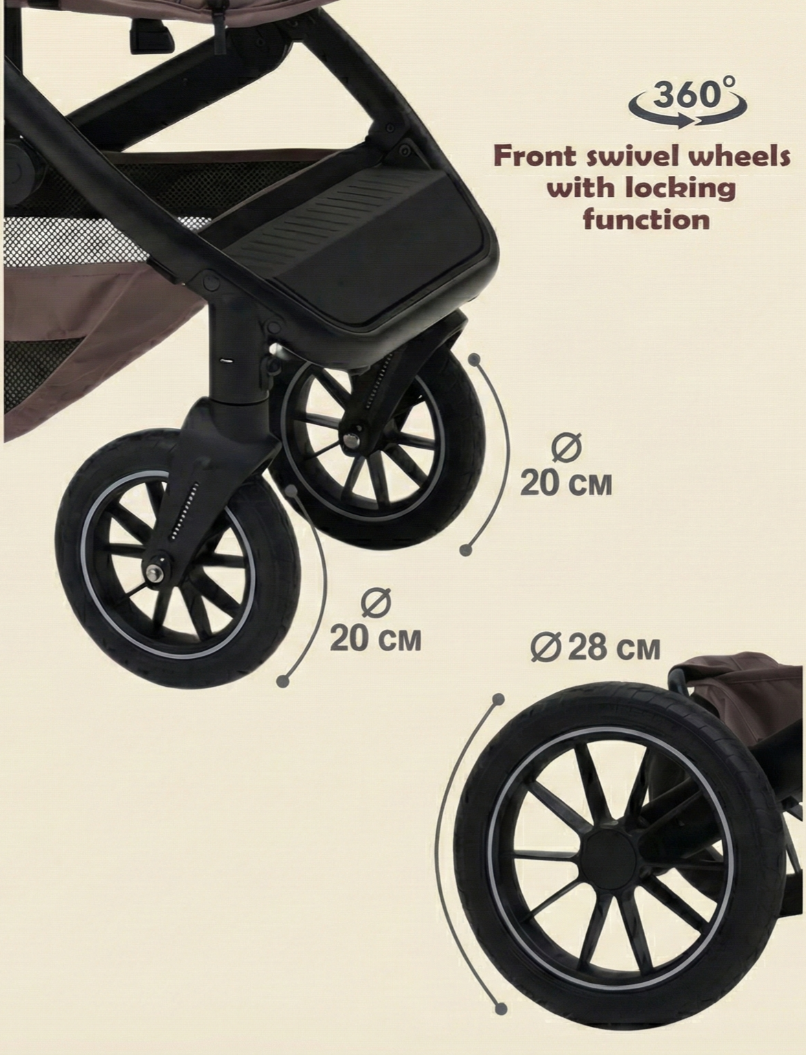 Cobblestones, grass, and gravel are no match for this chassis. Featuring massive 28cm rear wheels and 360° swiveling front wheels, The Executive delivers a buttery smooth ride that won't wake a sleeping baby.